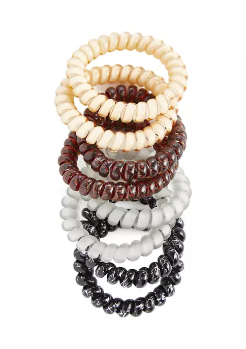 This pack of neutral toned coil scrunchies includes 2 black scrunchies, 2 white scrunchies, 2 brown scrunchies, and 2 cream scrunchies