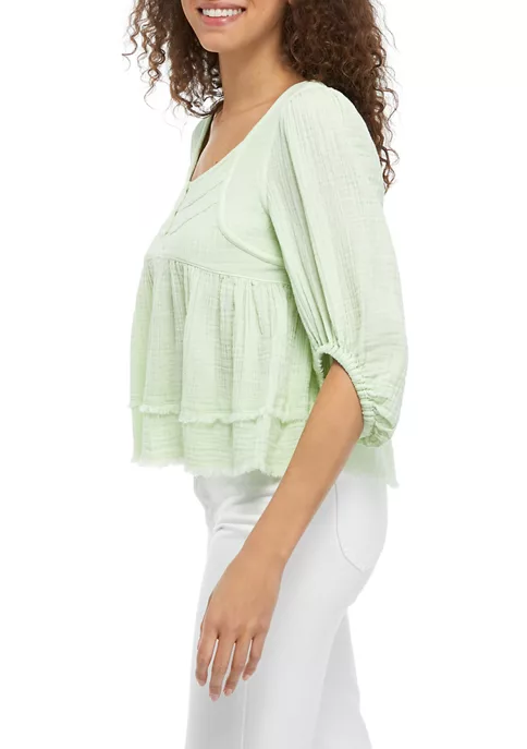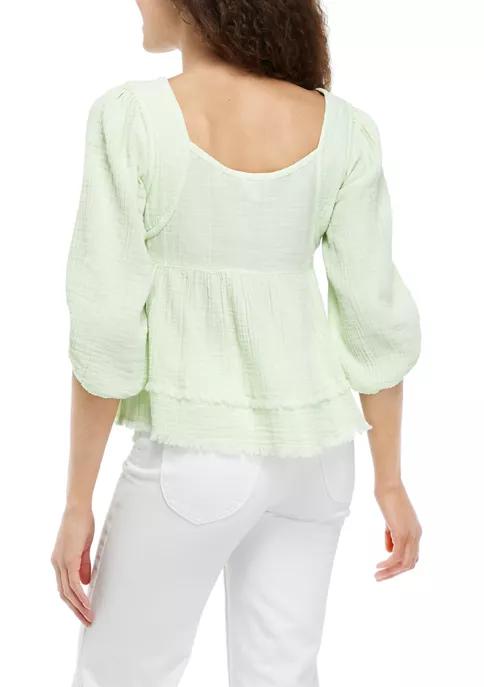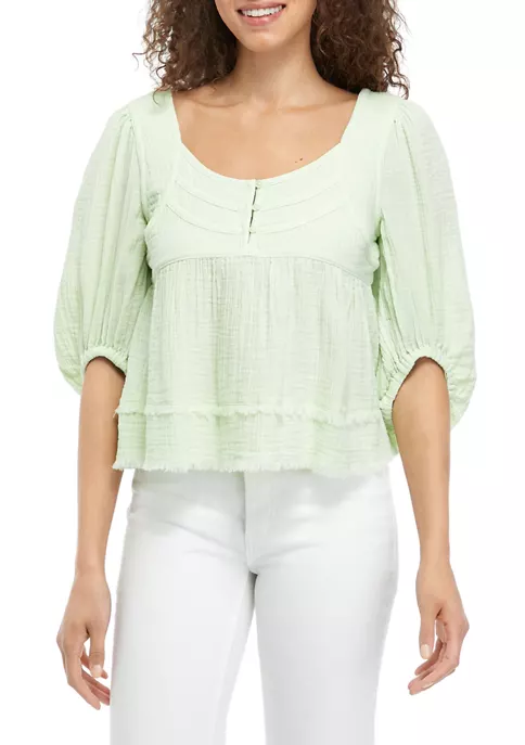 Billowy blouson sleeves and lightweight, subtly textured fabric define the cool, contemporary style of this button-front blouse from TRUE CRAFT.