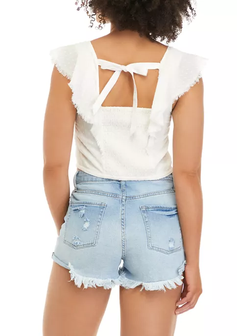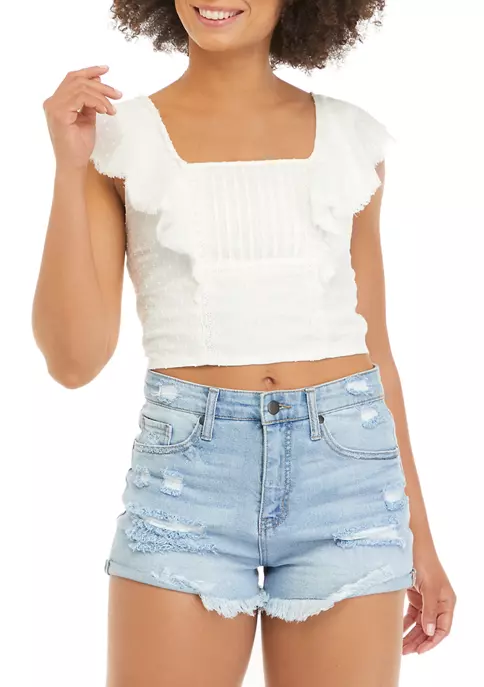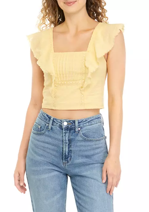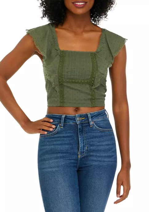 A squared neckline and cropped silhouette collide on this TRUE CRAFT top that’s feminized by fluttery sleeves.