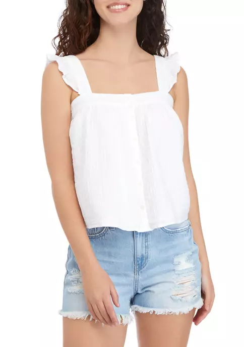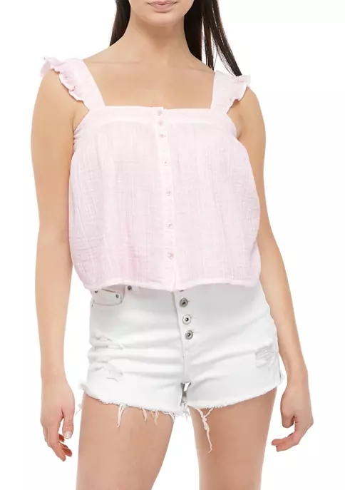 Designed in a boxy fit, this tank top from TRUE CRAFT hits above the hip and is made from textured gauze fabric with ruffle detail at straps and functional buttons at the front neck.