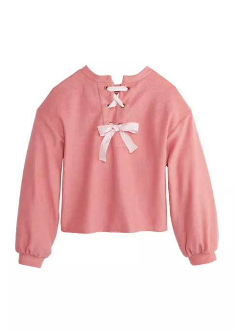 Bows embellish the back of this pullover from TRUE CRAFT that features balloon sleeves she will love.