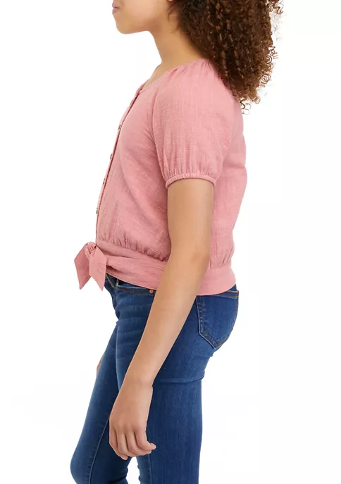 Accented with a tie front detail, this short sleeve button-front top from TRUE CRAFT looks great with her favorite jeans or leggings.