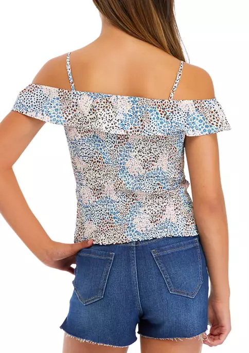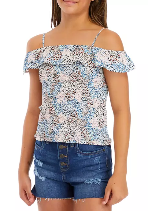 Smocked from shoulder to them, this girls tank from TRUE CRAFT features ruffled off-the-shoulder sleeves for a fashionable finish.