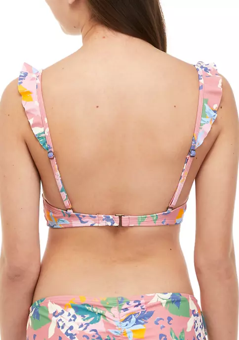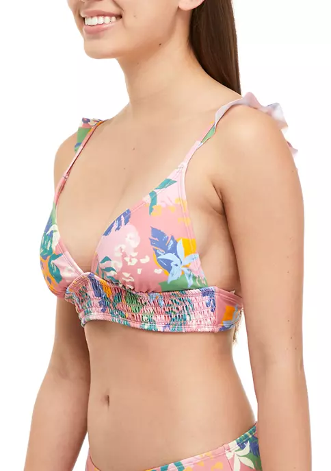 A smocked waistband and ruffled detailing add flattering femininity to this swim bralette from TRUE CRAFT that’s covered in a tropical print in bold colors.
