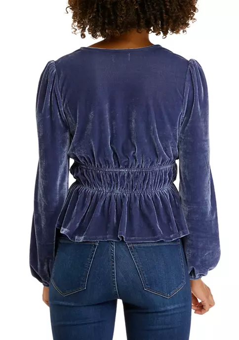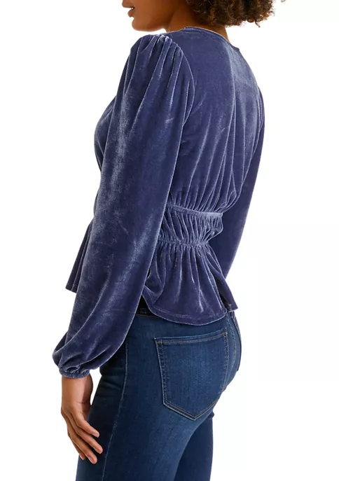 Effortlessly chic, this velvet top from TRUE CRAFT features a crossover V-neckline and pretty puff sleeves.