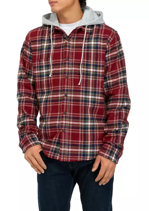 A classic buffalo check print enlivens this button-up flannel shirt from TRUE CRAFT, with a hood for a casual cold-weather look.