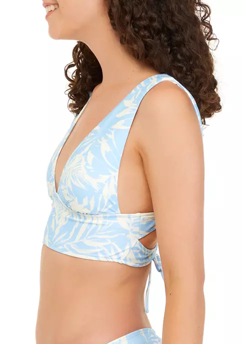 A plunging V-neck and tropical-inspired print define the Seaside Palms midkini swim top from TRUE CRAFT.