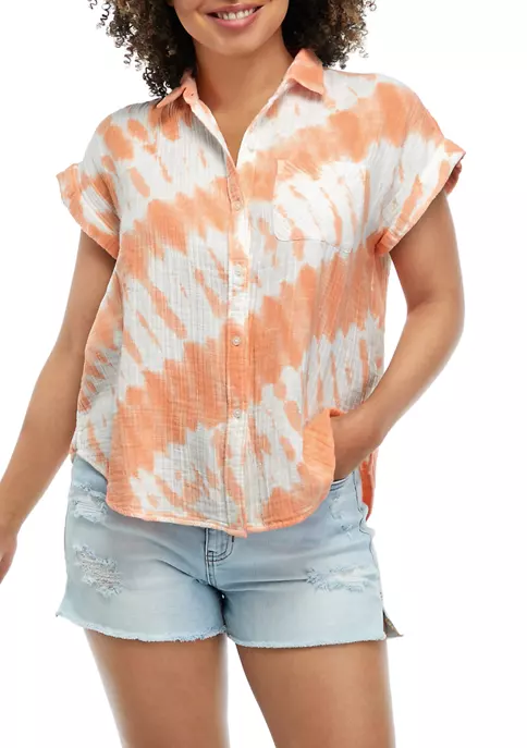 Covered in whimsical tie-dye, this camp shirt, made from gauzy cotton, is updated with a collar and high-low hem.
