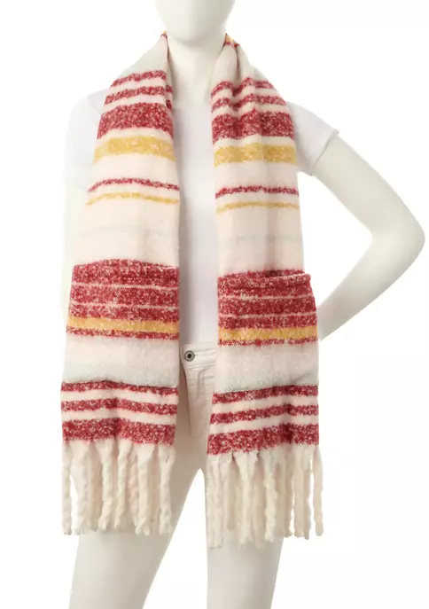 Featuring bold stripes, this cozy blanket scarf from TRUE CRAFT adds a pop of color to your cold-weather ensemble.
