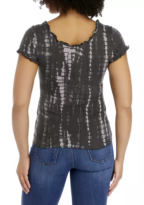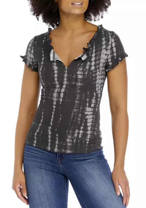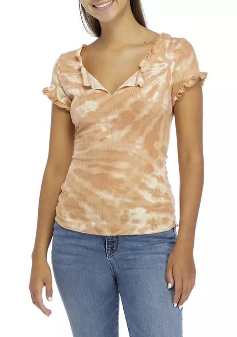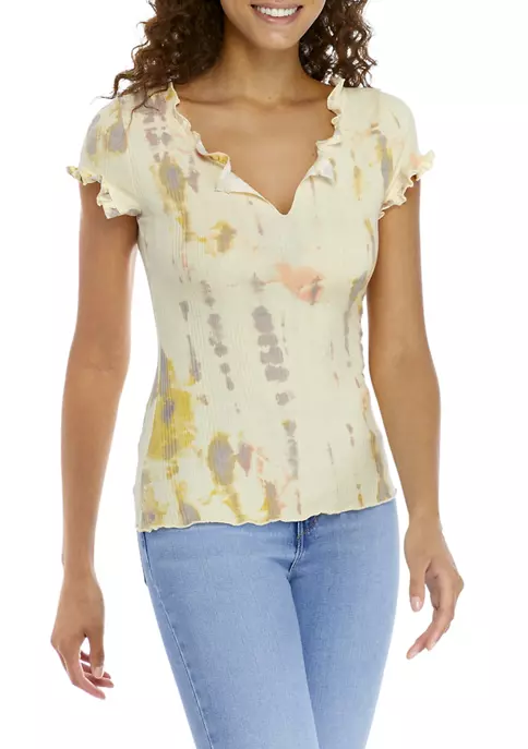 All-over ribbing and lettuce edging merge style with texture on this tie-dyed split-neck top from TRUE CRAFT.