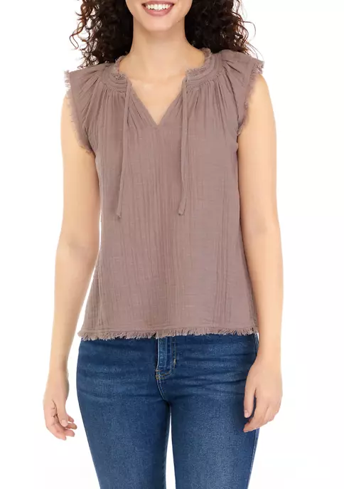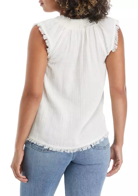 Fluttery shoulders and frayed trim lend shabby-chic femininity to this top that’s crafted out of lightweight cotton and finished with a tie neckline.