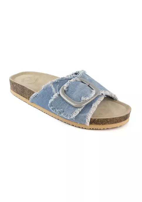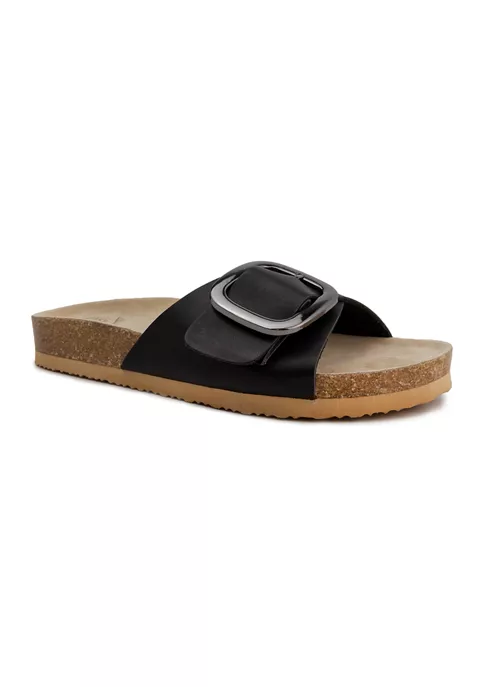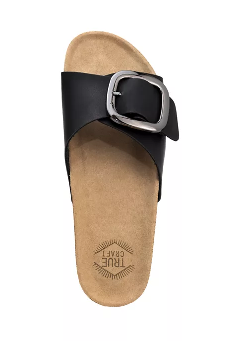 A thick strap with a buckle accent adds character to these slip-on sandals from TRUE CRAFT.